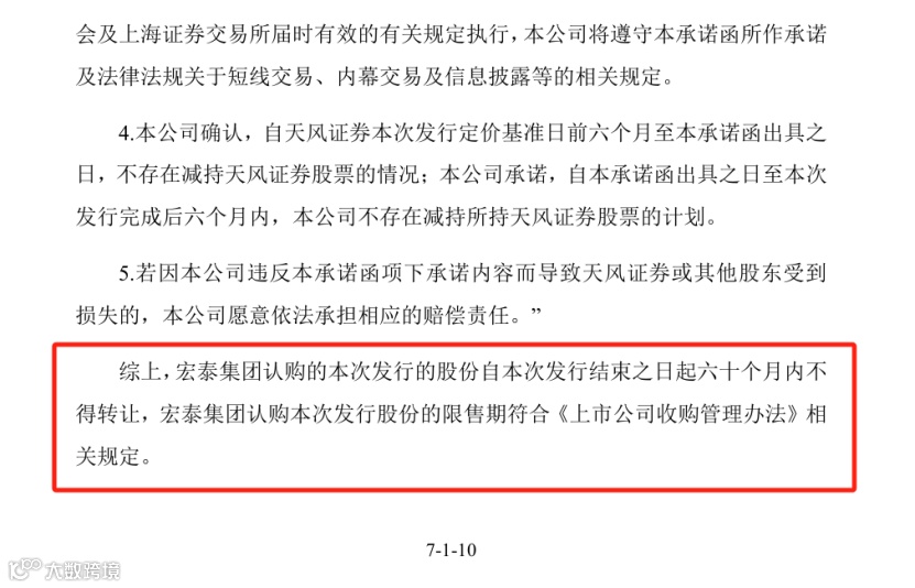 对此,天风证券答复称,宏泰集团作为公司控股股东,承诺其认购的本次发行股份自发行结束之日起六十个月内不得转让,这一承诺期限长达5年。市场分析人士称,此举满足了规则要求且充分考虑了保护中小投资者利益。