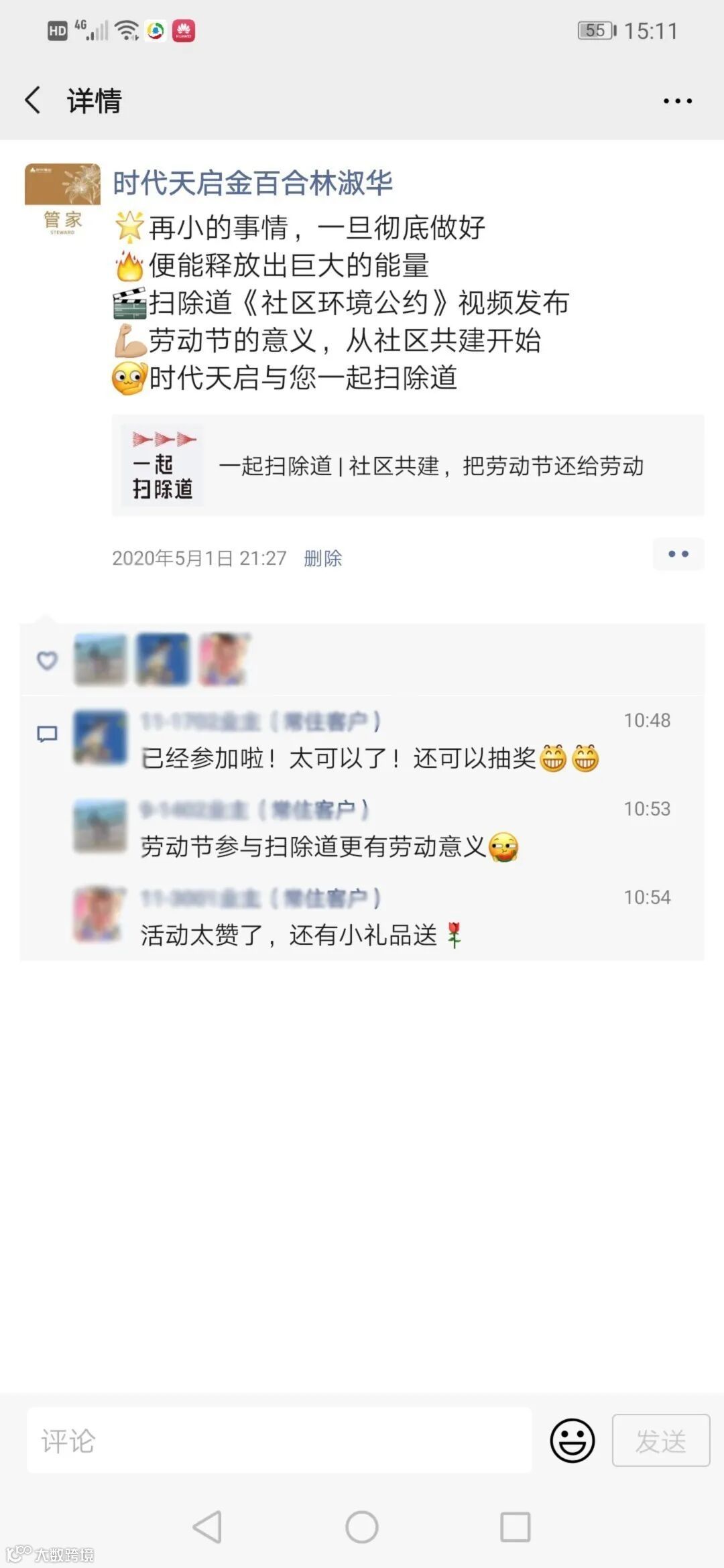 5月劳动节,我们邀请时代业主一起成为社区共建倡议人,线上签署环境公约,为社区共建打下基础。截止5月7日,在广州公司(东区)共计14个社区的1489名业主参与了线上签署活动。