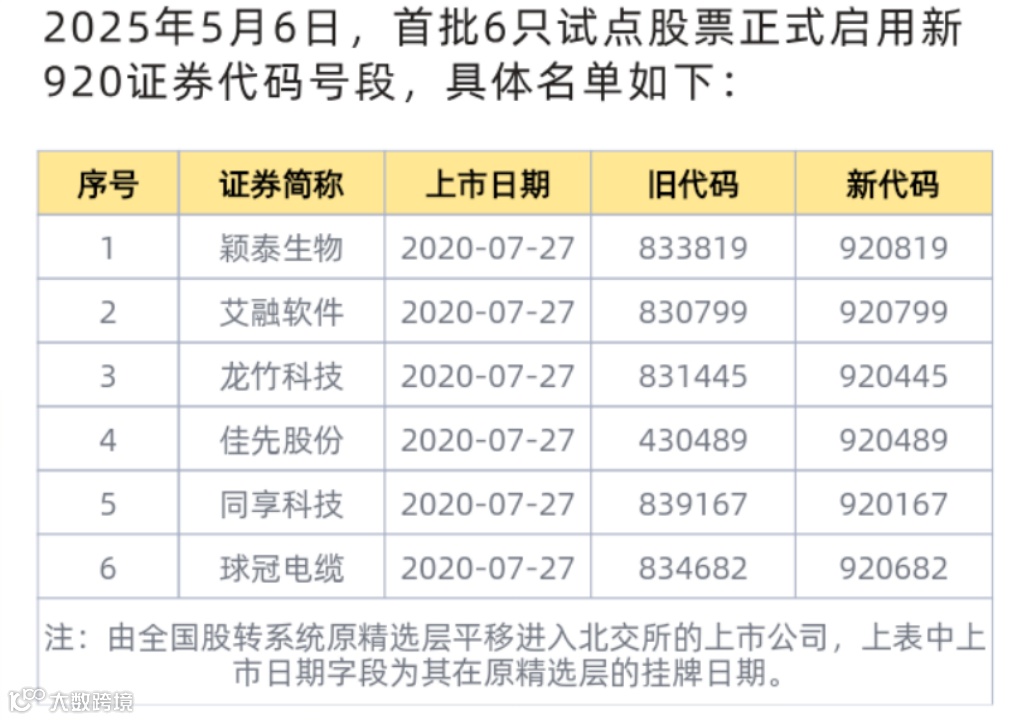 具体来看,共计6只证券代码前三位变更为920,分别是833819(颖泰生物)、830799(艾融软件)、831445(龙竹科技)、430489(佳先股份)、839167(同享科技)、834682(球冠电缆)。北交所新股此前已开启了920代码。股票切换规则是对前三位代码变更为920,后三位不变。