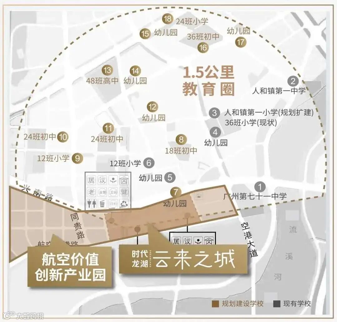 项目雄踞以白云机场为原点,面向世界的AOD大动脉。项目自身配建12班幼儿园,周边现有人和镇第一小学(市一级)、才子小学、人和镇第一中学(市一级)、第七十一中学(省一级高中)等,1.5公里内,规划新增十多所学校,满足3-18岁年龄段教育需求。