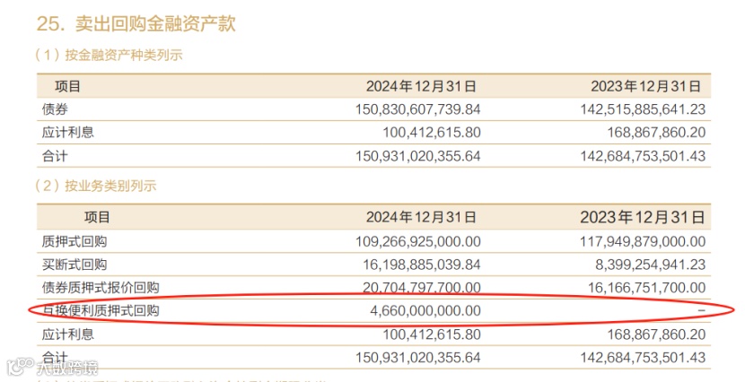 招商证券互换便利质押式回购46.6亿元,该科目2023年底为0。
