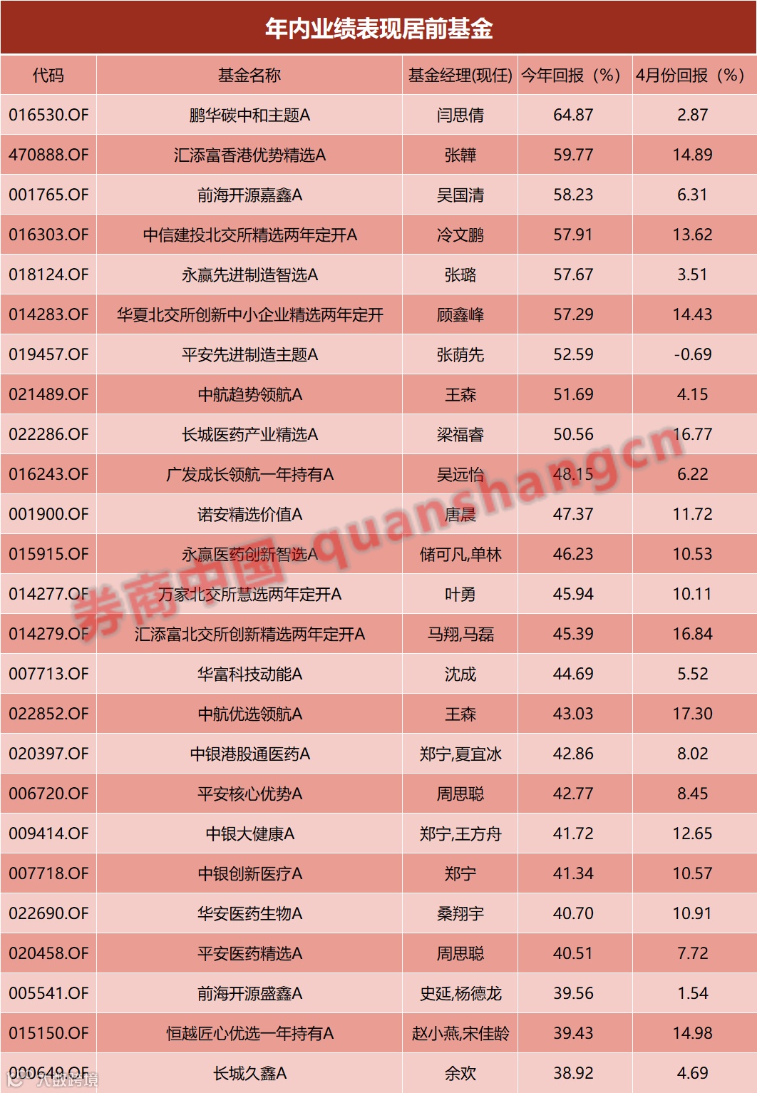 基金年内业绩重新洗牌,一大批创新药主题基金冲上业绩涨幅前列,汇添富香港优势精选在4月份一度占据年内业绩榜首,不过随着机器人行情回暖,鹏华碳中和主题在4月收官之日再度重夺基金年内业绩榜首。