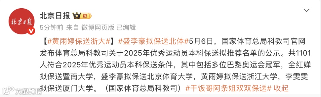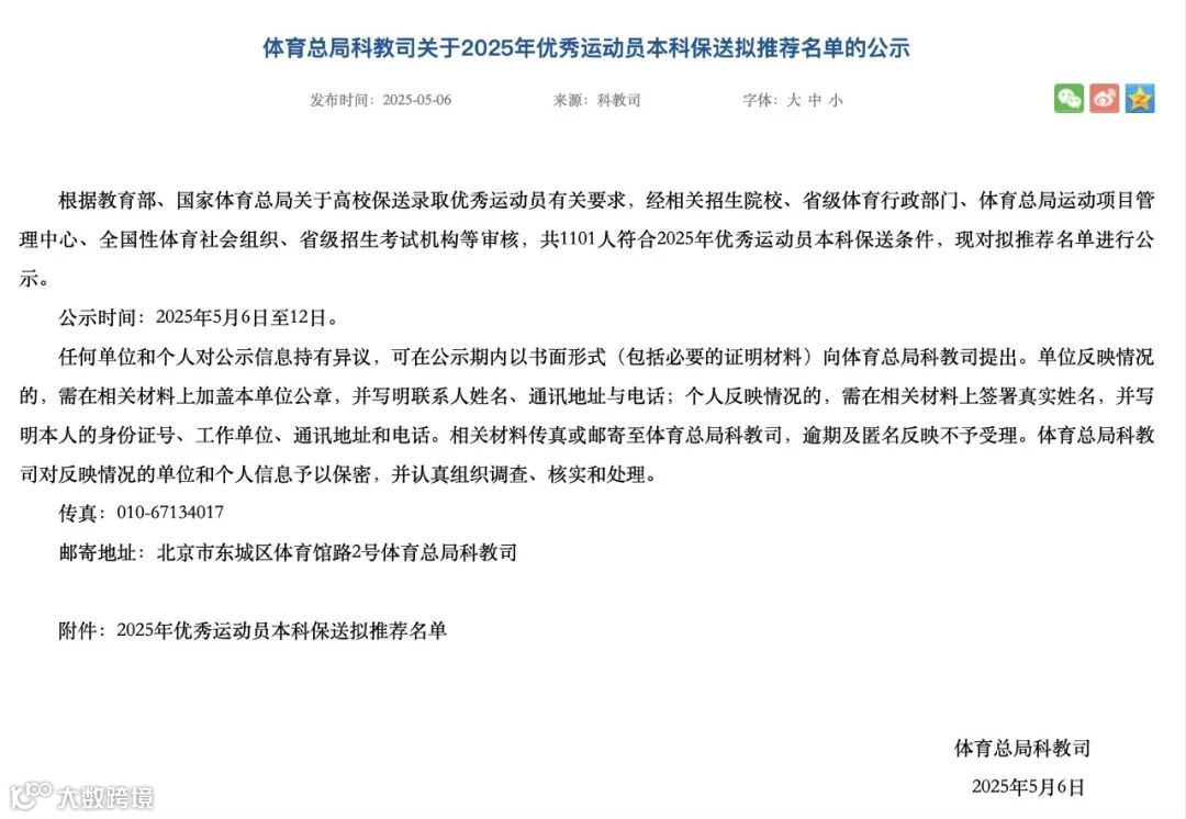 5月6日,国家体育总局科教司官网发布体育总局科教司关于2025年优秀运动员本科保送拟推荐名单的公示。