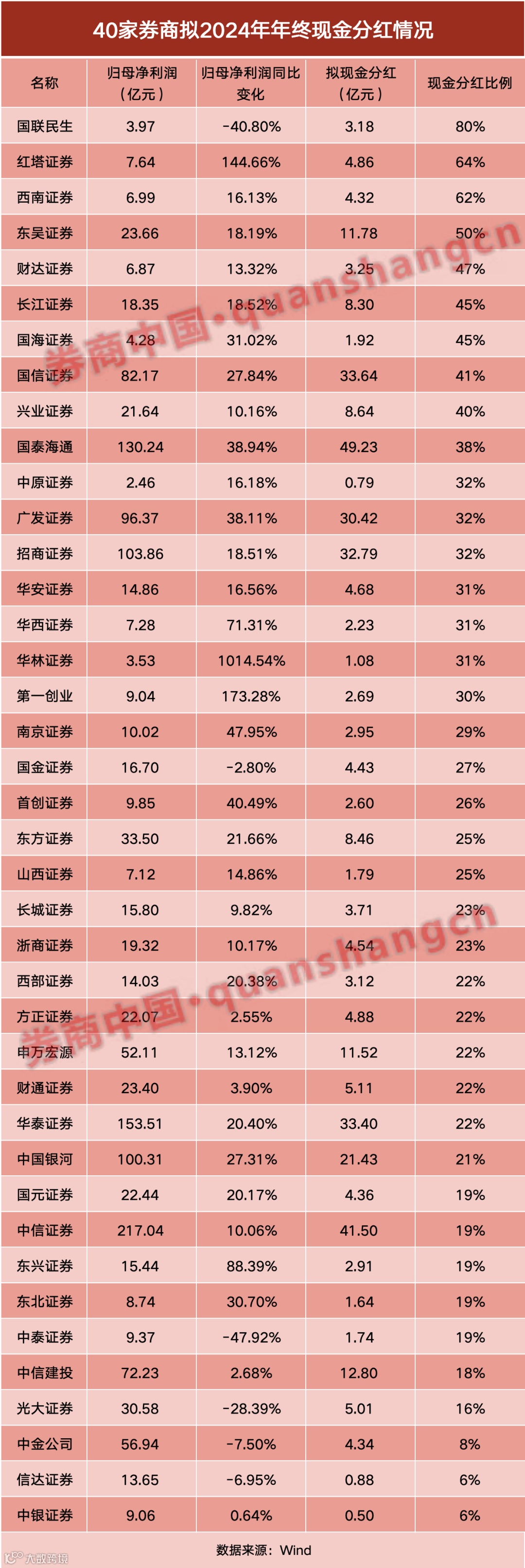 如果从现金分红比例(年终分红金额占归母净利润)角度看,会发现中小券商分红更加大方。