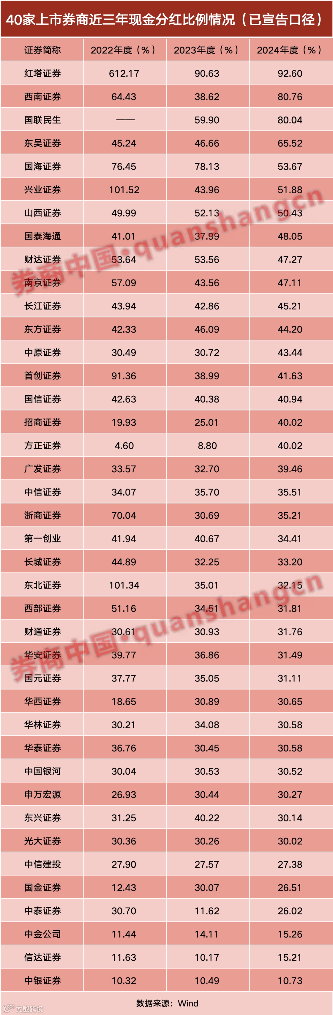 有29家券商已经做到最近三年持续稳定分红,2022—2024年现金分红比例均在30%(含)以上。比较典型的如红塔证券,每年现金分红比例都高居榜首,2023年、2024年均在90%以上,2022年高达612.17%。