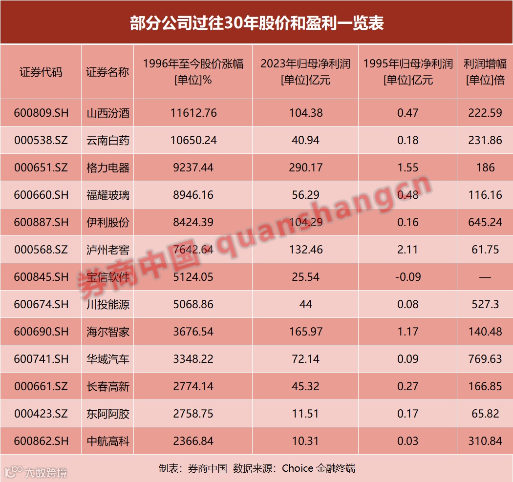 格力电器于1996年11月上市,该公司1995年的归母净利润为1.55亿元,而2023年的净利润为290亿元,增幅为186倍,公司的股价也在过往30年中上涨了92倍。