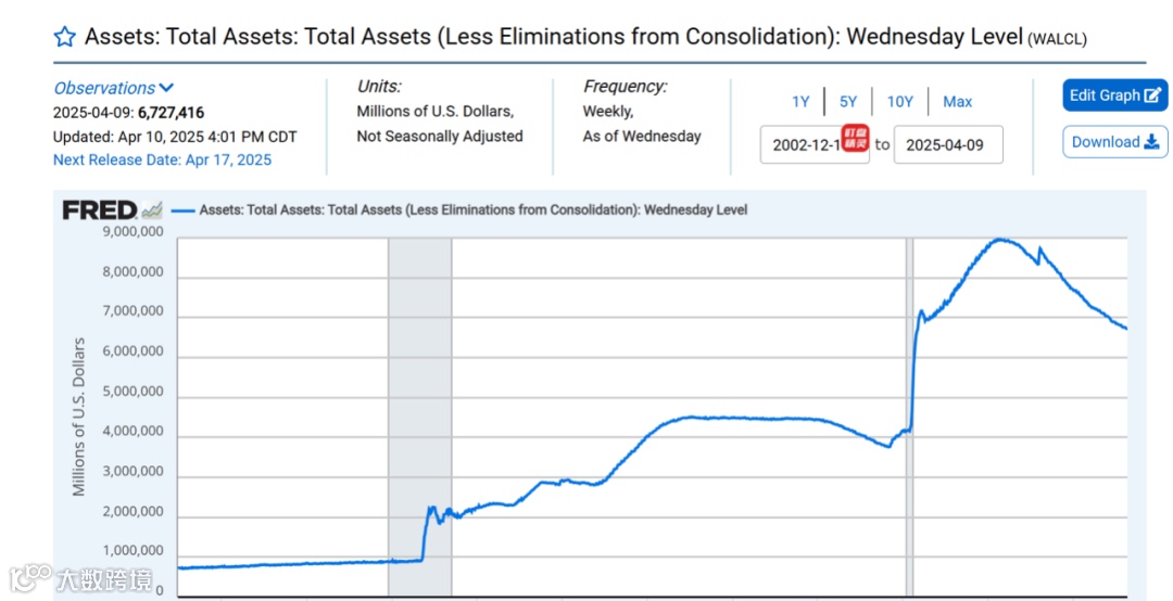 在美股大动荡时刻,据美联储资产负债表截至当地时间4月9日的数据显示,其总资产达到了 67274.16亿美元,这比上次公布的4月2日的67234.52亿美元反弹了近40亿美元。这几乎也是自2023年美国硅谷银行危机之后,美联储总资产首次扩张。市场通常将该资产扩张视为QE,那么这种趋势能否延续?