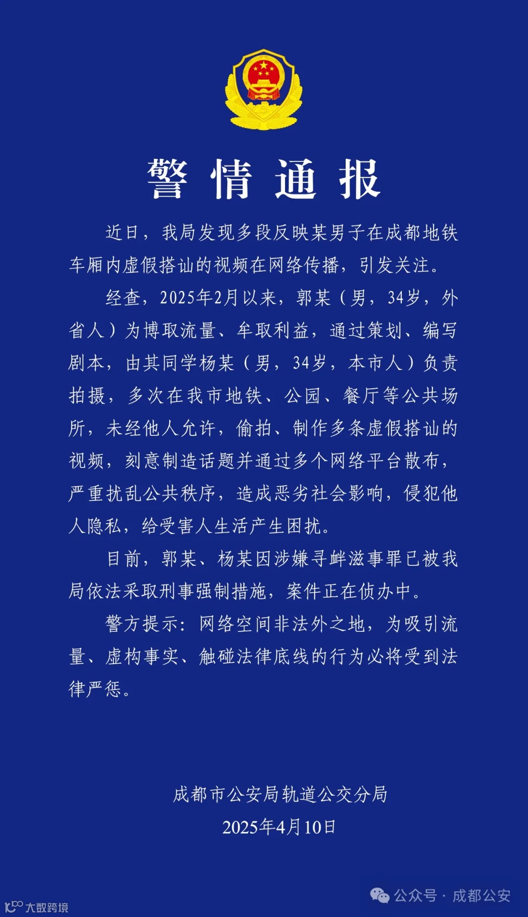 4月10日,成都市公安局轨道公交分局发布警情通报:
