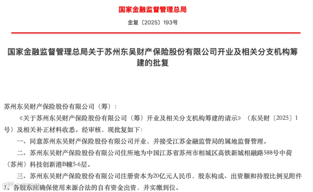 根据批复信息,东吴财险总部设在苏州,注册资本20亿元。去年9月25日,金融监管总局同意筹建东吴财险。此次获批开业离筹建获批仅7个月左右。