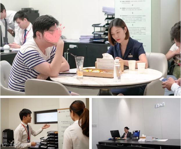 大多数地产签约室和银行有几分相似,进门一排柜台排开,客户一个个等着被叫号上前办理业务,柜台后是办事员机械地对着电脑操作,客户默默在柜台这边等着。这样的布局并未考虑到客户的办事体验,只是满足了业务办理的基本诉求。