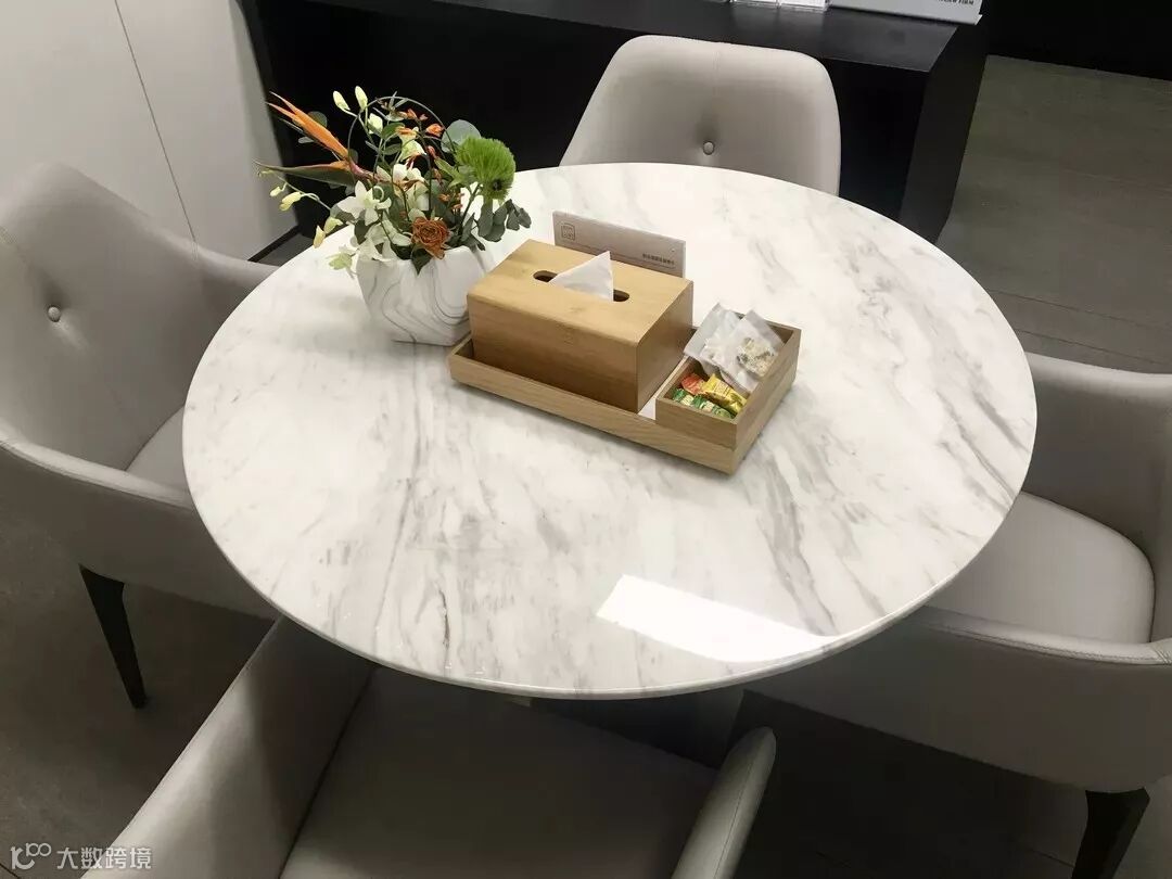 客户签约区使用一组组的圆桌和皮椅,客户可以舒适安坐于此,待工作人员将提前准备好的合同资料拿过来签署。桌面更是准备好了小点心和客户签约所需的一些小工具(湿纸巾、干纸巾等),花艺每周更换,力求让客户签约时的心情更美丽。