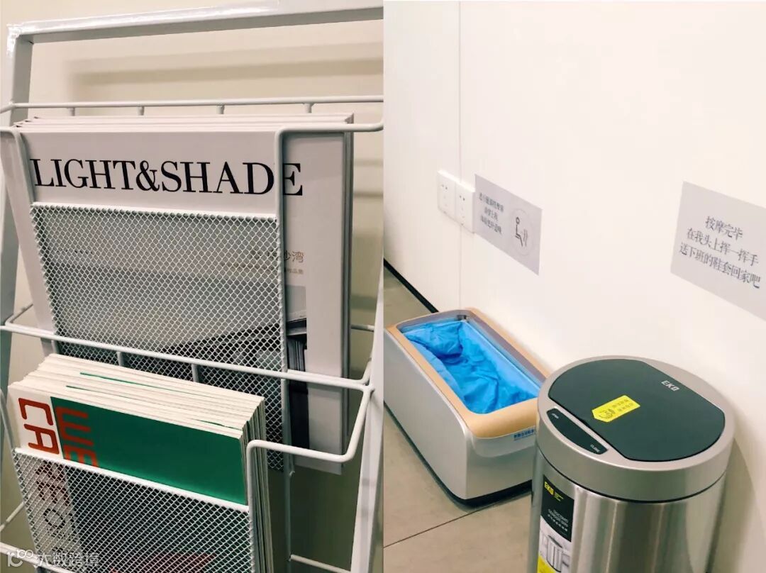 贴心的开发商还设置了书架,供客户按摩时取阅,如果需要按摩腿部、脚部,还有一次性鞋套提供,方便又卫生。