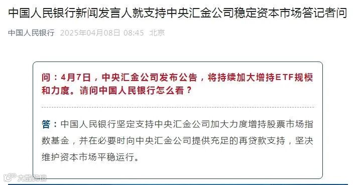 近日,美国政府滥施关税引发全球市场剧烈波动。4月7日,市场迎来“黑色星期一”,A股出现较大跌幅。当日尾盘时分,中央汇金发布公告称,坚定看好中国资本市场发展前景,充分认可当前A股配置价值,并表示已再次增持ETF,未来将继续增持。