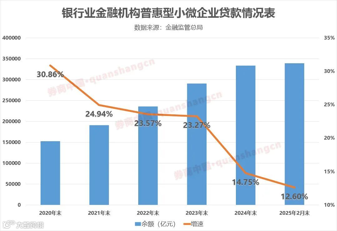 金融监管总局最新数据显示,截至2025年2月末,全国普惠型小微企业贷款余额已接近34万亿元,同比增速较各项贷款增速高5.7个百分点。尽管当前普惠小微信贷投放仍保持高速,但拉长时间周期看,贷款总量上台阶同时,增速也由此前几年的超20%放缓至12.6%。