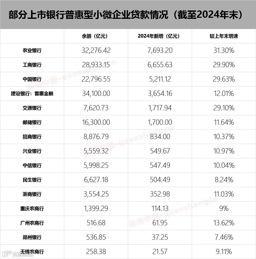近期,上市银行陆续发布2024年度业绩报告。券商中国记者梳理发现,在目前已公布年报的上市银行中,至少10家银行的普惠型小微企业贷款(下称“普惠小微贷款”)增速超10%。其中,农业银行、工商银行、中国银行、交通银行的普惠型小微贷款增速均超过29%,分别达到31.3%、29.9%、29.63%和29.1%。