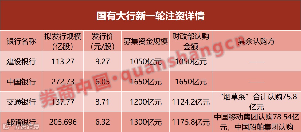 其中,中国银行、建设银行分别拟发行不超过272.73亿股、113.27亿股,每股发行价分别为6.05元、9.27元。财政部将分别出资1650亿元、1050亿元认购两家银行全部新增股份。