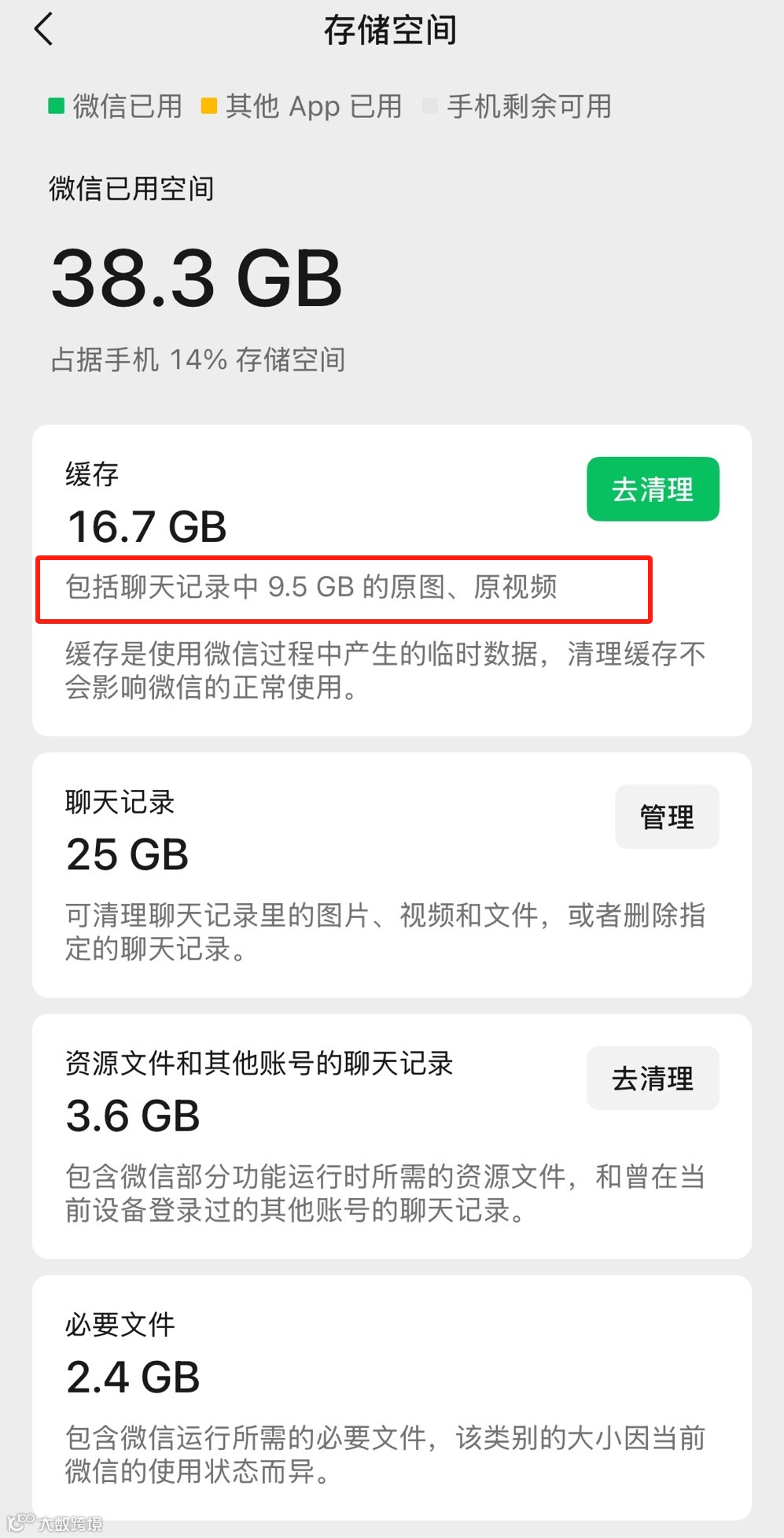 在“我-设置-通用-存储空间”界面中缓存区域下方新增一行小字,包括聊天记录中的xx MB的原图、原视频,点击“去清理”后,能看到两个选项:已发出的原图、原视频和已接收的原图、原视频,在选项上方有一排小字清理原图、原视频可以节省存储空间。被清理的内容仍会在聊天记录中显示,但画质已降低,该功能既能避免“图片已过期”,还能腾出存储空间实现微信瘦身。