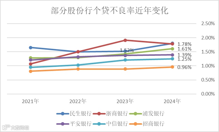 与国有大行类似,在股份行中,民生银行、浦发银行、平安银行、中信银行2024年末的个贷不良率均较上一年有所攀升。其中,民生银行2024年末的个人不良贷款率1.80%,比上年末上升0.28个百分点,是上述股份行中上升幅度较大的银行。