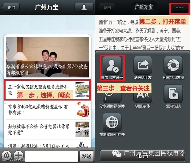 点击右上角按钮就可加关注“广州万宝集团民权电器”哦。它将为大家带来更多的服务与优惠。
