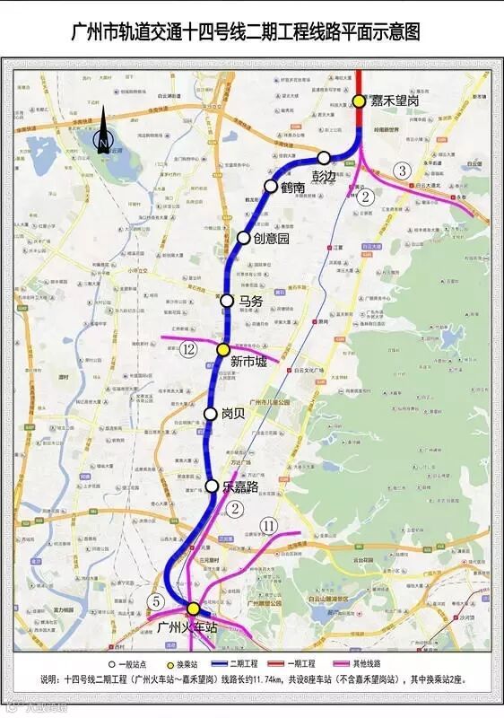 14号线二期(广州火车站-嘉禾望岗):起于广州火车站,沿广园西路、机场路、106国道至嘉禾望岗站。