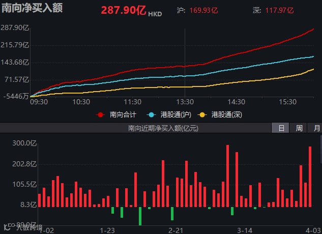 4月3日,在港股大幅调整的过程中,南向资金疯狂抄底。截至当日收盘,南向资金净买入额达到287.9亿港元,为历史单日净买入第二高,仅次于3月10日创下的296亿港元最高净买入纪录。