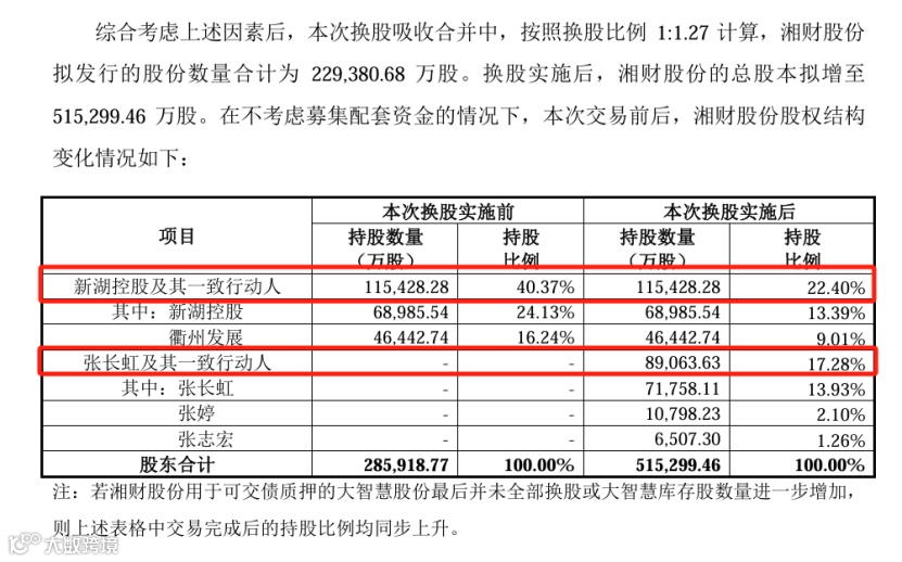 交易完成后,湘财股份总股本将增至51.53亿股,控股股东新湖控股及其一致行动人持股比例由40.37%降至22.4%,但实际控制人黄伟地位不变。大智慧控股股东张长虹及其一致行动人将持有湘财股份17.28%股权,并承诺不谋求控制权。