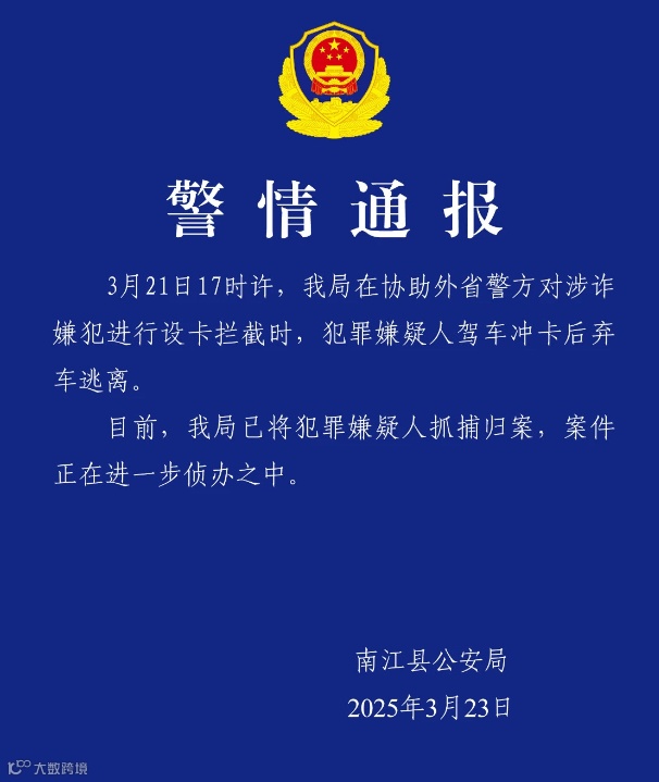 四川南江县警方:警方对涉诈嫌犯进行设卡拦截时嫌疑人冲卡后弃车逃离,已被抓捕归案。