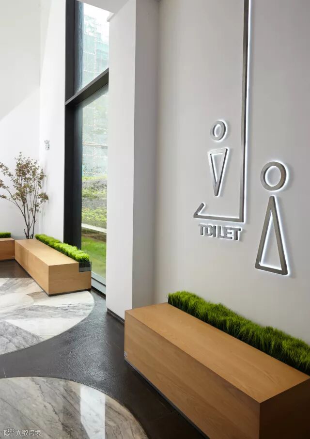 在洗手间外部的设置明亮休息区,