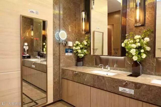 各类高低挂钩、储物收纳设计,如厕洁具消毒液,全自动配置的垃圾桶、洗手液泡沫机满足了来宾的如厕需求。LED化妆镜、全身镜、半身镜,盛放美发用品、润手霜、一次性梳子以及各类贴心用品的百宝盒,满足来宾注重仪容仪表的需求。
