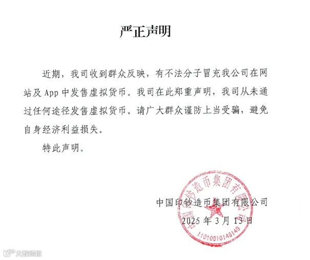 3月13日,中国印钞造币集团有限公司发布声明:近期,我司收到群众反映,有不法分子冒充我公司在网站及App中发售虚拟货币。我司在此郑重声明,我司从未通过任何途径发售虚拟货币。请广大群众谨防上当受骗,避免自身经济利益损失。