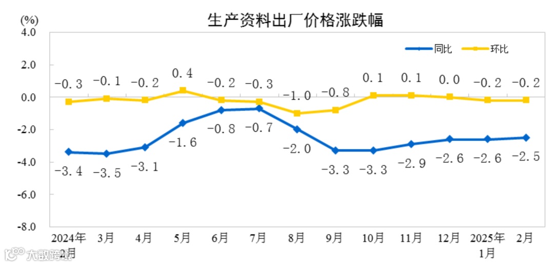 2025年2月份,全国工业生产者出厂价格同比下降2.2%,环比下降0.1%,降幅比上月均收窄0.1个百分点;工业生产者购进价格同比下降2.3%,环比下降0.2%。1—2月平均,工业生产者出厂价格比上年同期下降2.2%,工业生产者购进价格下降2.3%。