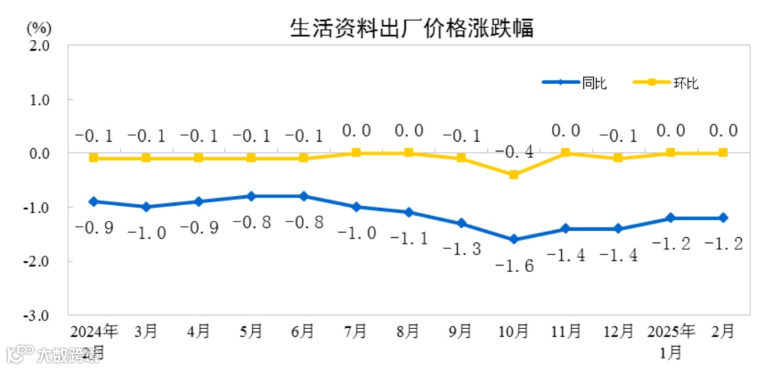 2月份,工业生产者出厂价格中,生产资料价格下降0.2%,影响工业生产者出厂价格总水平下降约0.14个百分点。其中,采掘工业价格下降1.3%,原材料工业价格上涨0.1%,加工工业价格下降0.2%。生活资料价格持平。其中,食品价格下降0.2%,衣着价格下降0.2%,一般日用品价格上涨0.1%,耐用消费品价格持平。