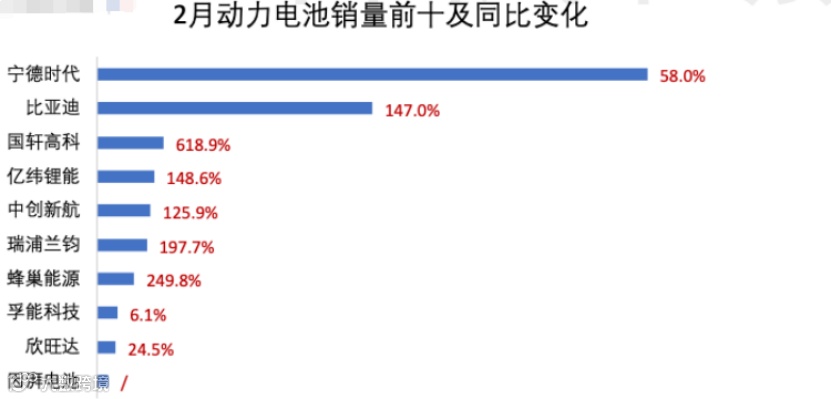 最新披露的数据显示,2月份我国动力电池销量为66.9GWh,同比增长98.8%。其中,宁德时代的动力电池销量同比增长58%,比亚迪同比增长147%,国轩高科同比增长618.9%,亿纬锂能同比增长148.6%。