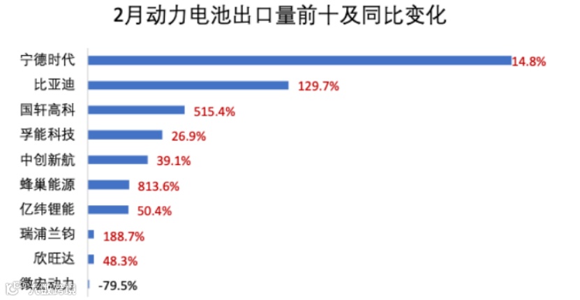 2月份,我国动力电池出口量排名前十的企业分别为:宁德时代、比亚迪、国轩高科、孚能科技、中创新航、蜂巢能源、亿纬锂能、瑞浦兰钧、欣旺达、微宏动力。其中,比亚迪动力电池出口同比增长129.7%,国轩高科同比大增515.4%,蜂巢能源同比增长813.6%。