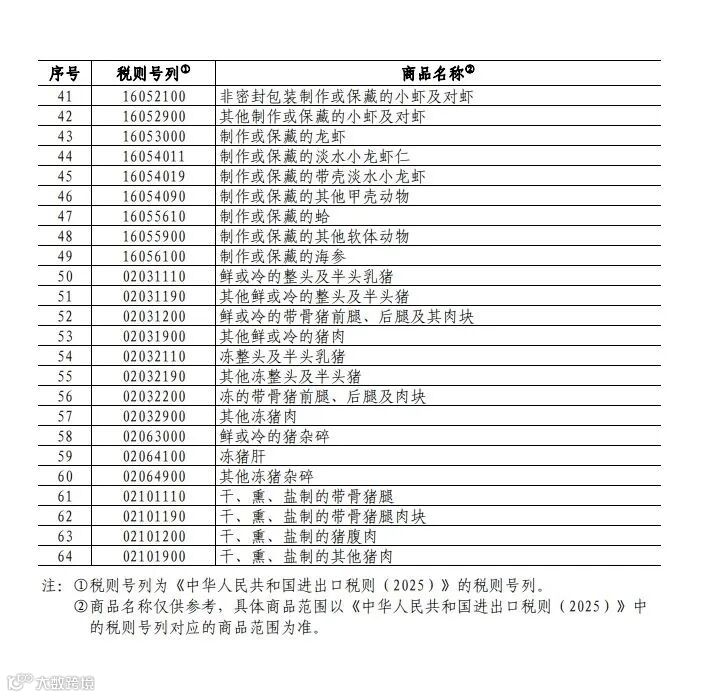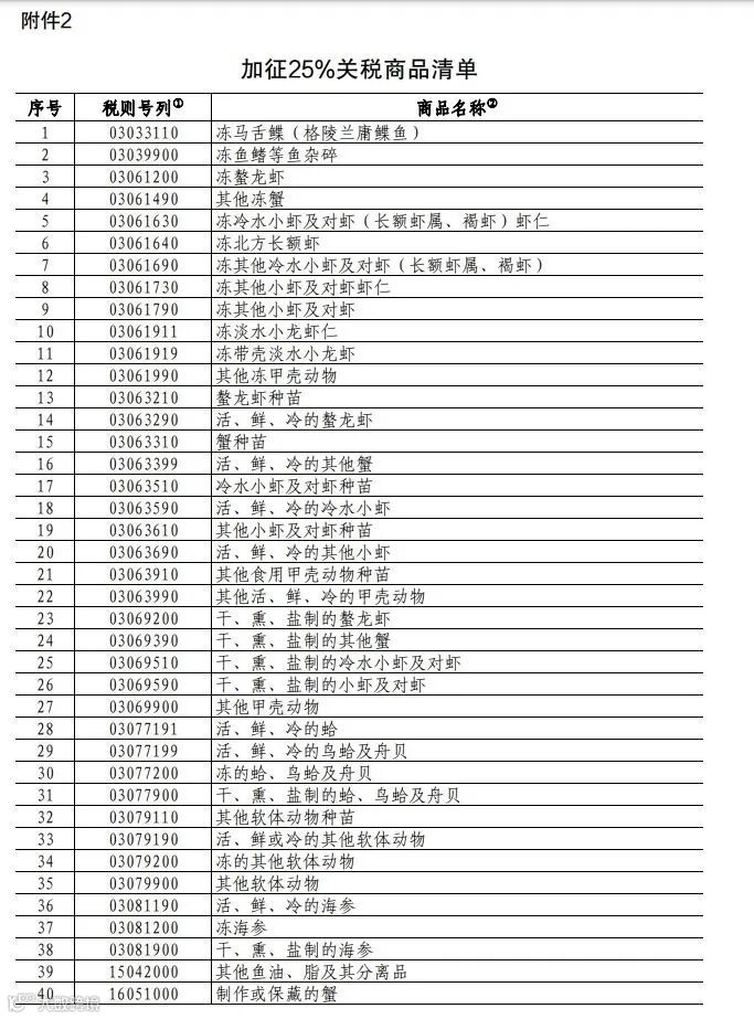 二、对水产品、猪肉加征25%关税,具体商品范围见附件2。