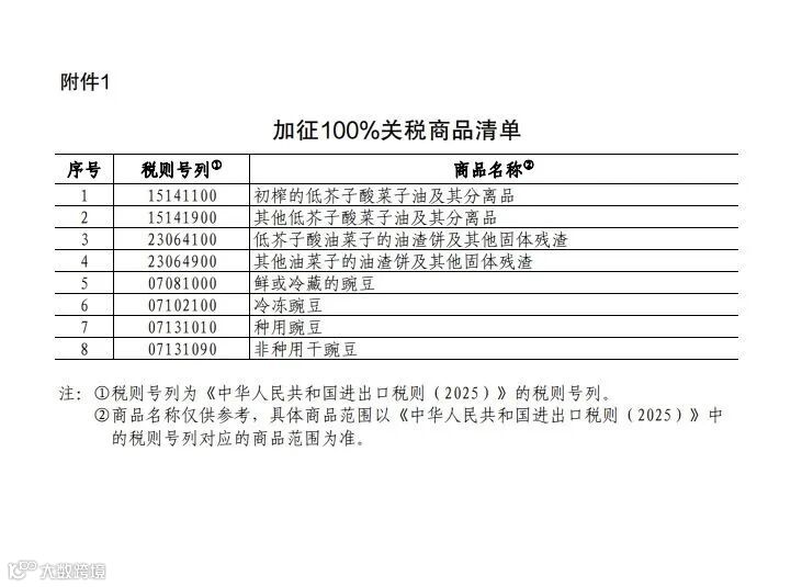 一、对菜子油、油渣饼、豌豆加征100%关税,具体商品范围见附件1。