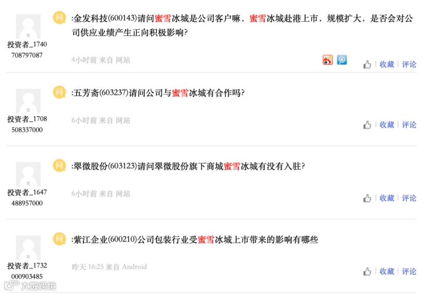 与此同时,不少投资者也在互动平台连环发问:“蜜雪冰城是不是公司客户”“与蜜雪冰城有合作吗”“有没有投资蜜雪冰城”,期待能乘上“‘雪王’概念股”的东风。