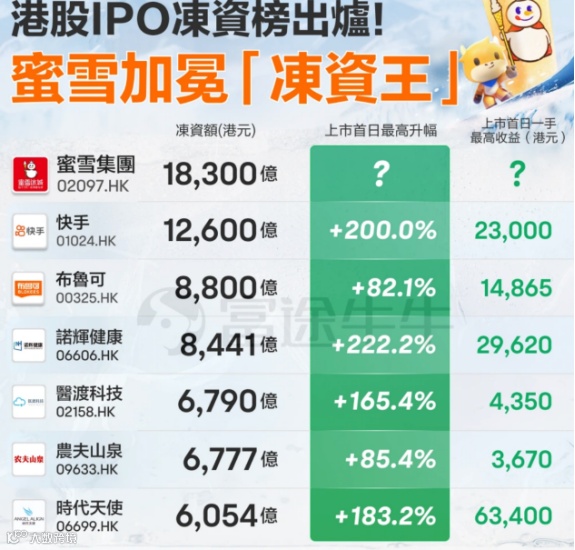 纵观港股IPO历史,所有冻资超过6000亿港元的IPO,上市首日均录得升幅,赚钱效应显著。