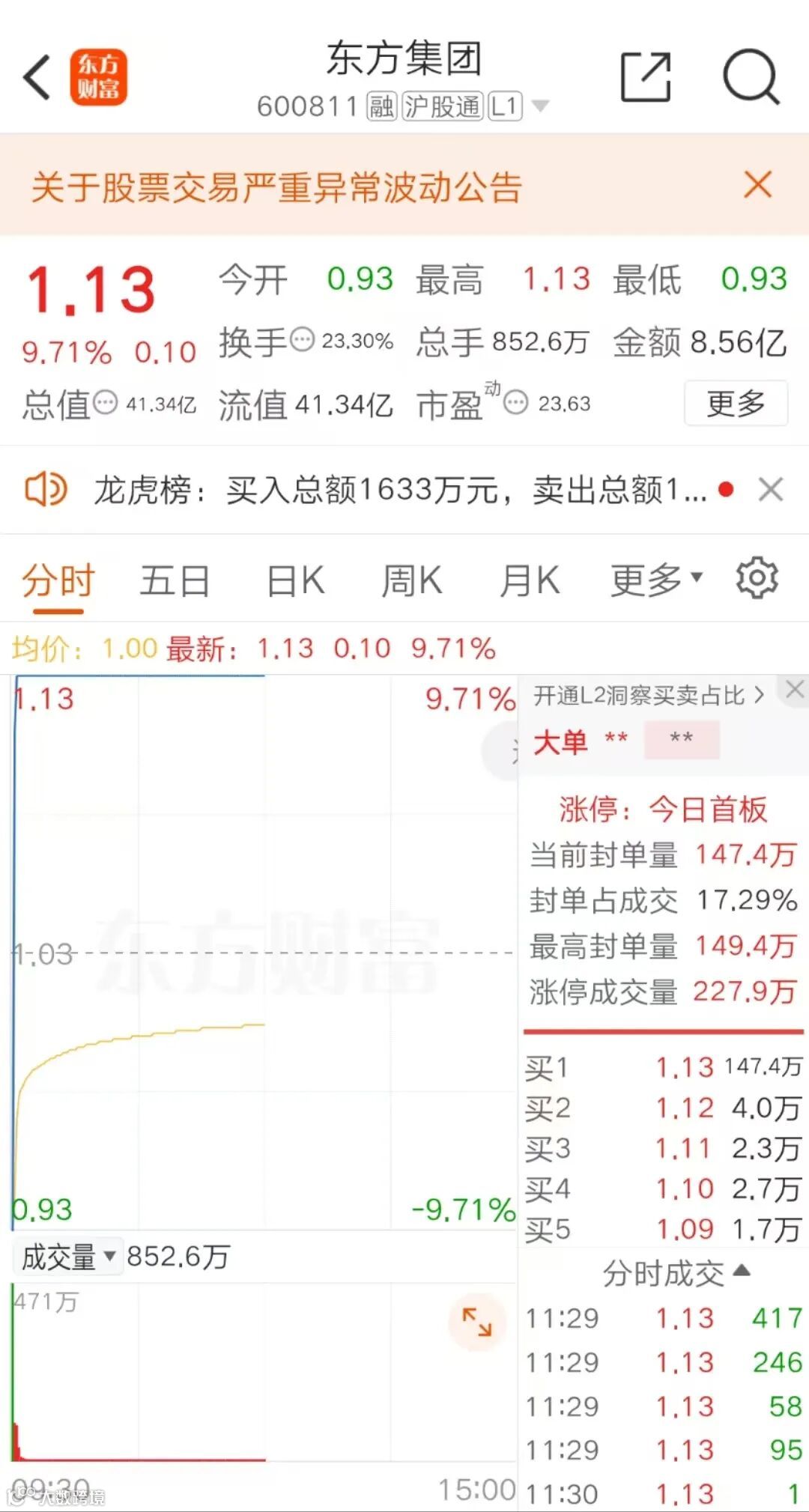 在东方集团连续跌了七个跌停板之后,今天早上亦一度跌停,并跌破1元/股,但随后股价快速拉升涨停,上演“地天板”走势,截至上午收盘,成交额超8亿元。