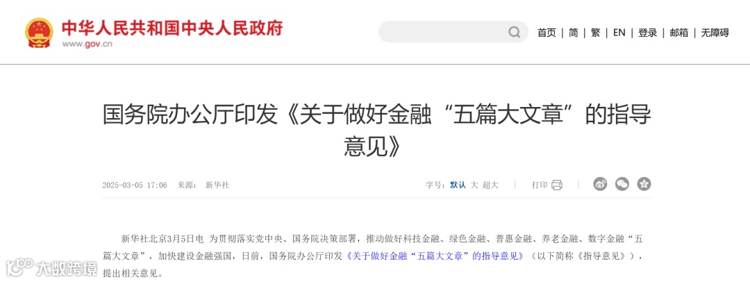 为贯彻落实党中央、国务院决策部署,推动做好科技金融、绿色金融、普惠金融、养老金融、数字金融“五篇大文章”,加快建设金融强国,经国务院同意,现提出以下意见。