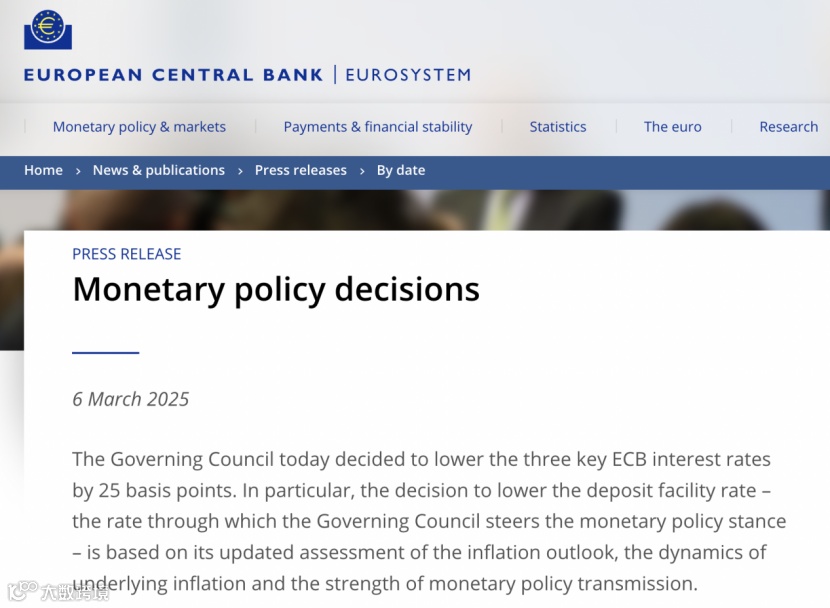 北京时间3月6日晚间,欧洲央行宣布,将三大关键利率下调 25 个基点。自2025年3月12日起,存款机制利率、主要再融资利率、边际贷款利率将分别降至2.50%、2.65%和2.90%,均符合市场预期。