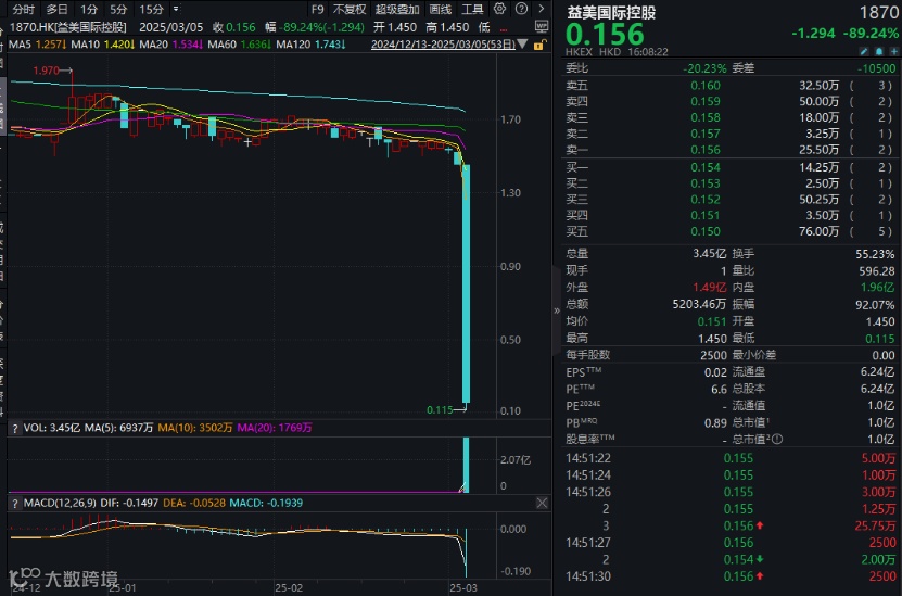 值得注意的是,在港股市场整体大涨的背景下,一只小盘股却突然放量暴跌。今日午后,益美国际控股(01870.HK)急速跳水,股价最低触及0.115港元,较昨日的收盘价1.45港元下跌92%,总市值跌破1亿港元。