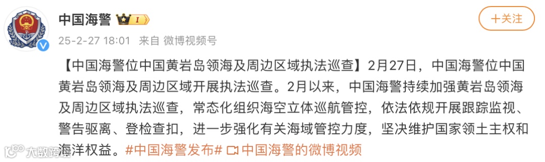 2月27日,中国海警位中国黄岩岛领海及周边区域开展执法巡查。2月以来,中国海警持续加强黄岩岛领海及周边区域执法巡查,常态化组织海空立体巡航管控,依法依规开展跟踪监视、警告驱离、登检查扣,进一步强化有关海域管控力度,坚决维护国家领土主权和海洋权益。
