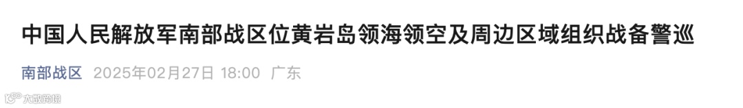 2月27日,中国人民解放军南部战区组织海空兵力位中国黄岩岛领海领空及周边区域开展战备警巡。2月以来,战区部队组织海空兵力持续加强中国黄岩岛领海周边海空域巡逻警戒,进一步强化有关海空域管控力度,坚决捍卫国家主权安全,坚决维护南海地区和平稳定。