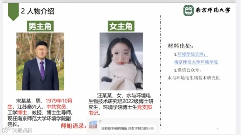 该男子称,自己的女友系南京师范大学环境学院博士生党支部书记,其导师为南京师范大学环境学院副院长。两人长期保持不正当关系,对方计划在女友毕业后为其安排去某研究院工作。