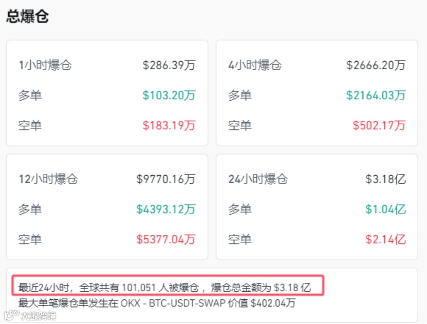 加密货币的剧烈波动,又导致不少人爆仓。coinglass数据显示,过去24小时内,加密货币全网合约爆仓人数超过10万人,爆仓金额超过3亿美元,其中空单爆仓超2亿美元。