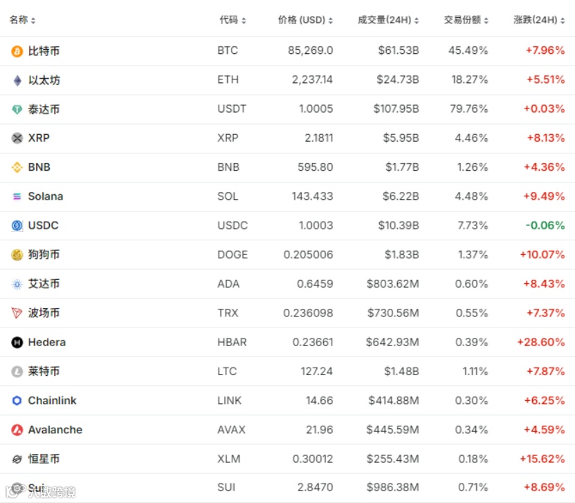 3月1日,加密货币集体拉升,比特币大涨近8%,以太坊涨超5%,艾达币涨超8%,Solana涨超9%,狗狗币涨超10%,Hedera更是飙涨超28%。