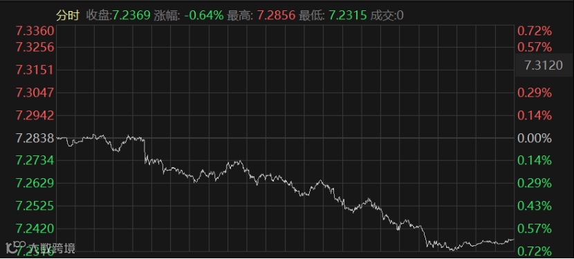昨晚,离岸人民币表现强劲。北京时间早上6点,美元兑离岸人民币(CNH)报7.2352元,人民币较周三纽约尾盘涨490点,盘中最多报至7.2315元。