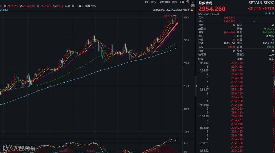 从2月初以来的金价走势图来看,特朗普每挥动一次“关税大棒”,国际黄金价格基本上都会跳涨至一个新的高度,现货黄金先是突破2800美元/盎司,随后又拿下2900美元/盎司。2月20日,现货黄金又突破了2950美元/盎司,继续刷新历史新高。