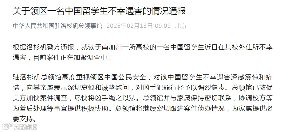 中国驻洛杉矶总领事馆微信公众号13日发布关于领区一名中国留学生不幸遇害的情况通报: